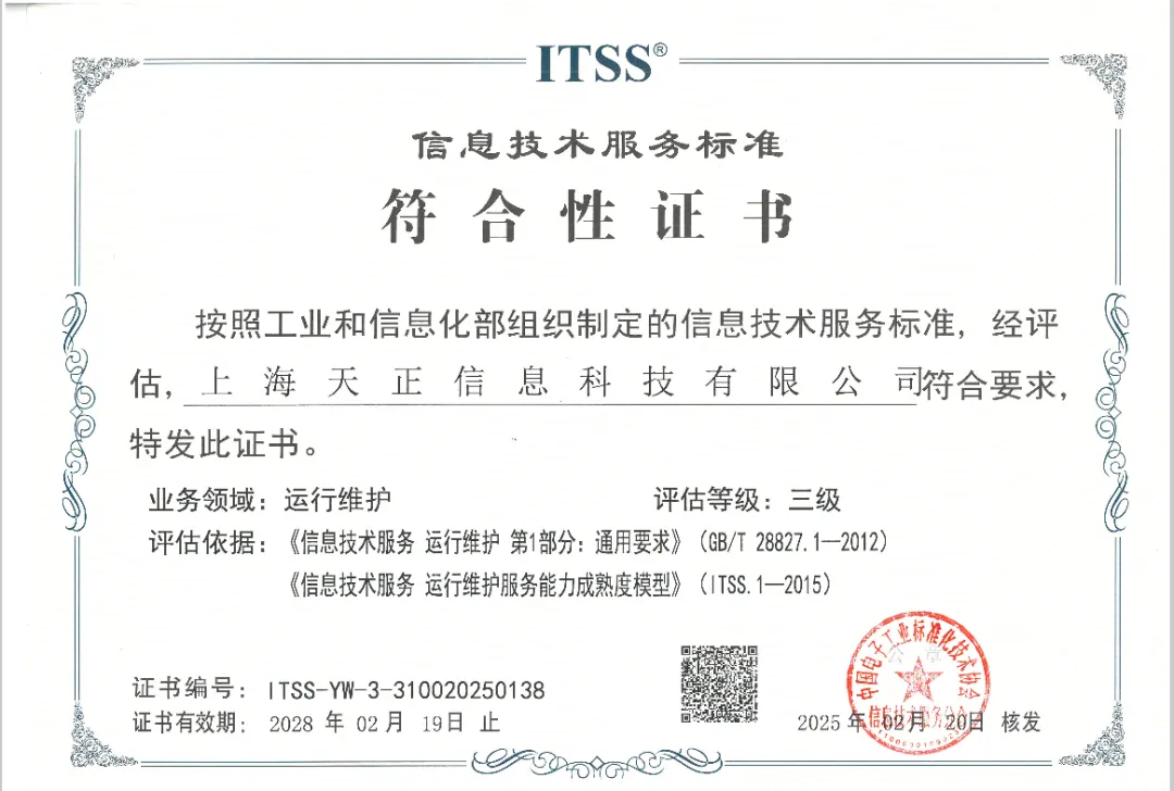 喜報!熱烈慶祝天正信息成功通過ITSS三級認證,邁向服務新高度!